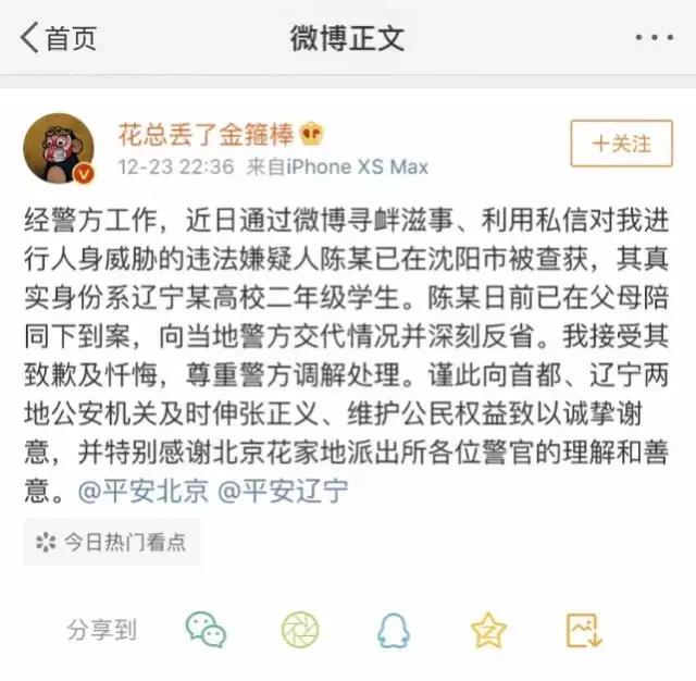 7、12月23日,曝光14家五星级酒店卫生乱象的微博博主“花总丢了金箍棒”发文称,在12月15日向其发私信称“找到你杀了你”等威胁言论的网友已经被警方找到,为就读于辽宁沈阳某大学的在校学生,目前已被批评教育。