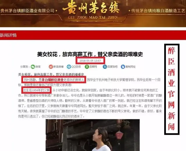 5、近日,贵州仁怀市委宣传部通报称,网传“陈静替父代言卖酒”广告系虚假宣传,部分推文是贵州省仁怀市茅台镇醉臣酒业有限公司自行设计、制作。该公司因虚假宣传被罚款4.5万元。