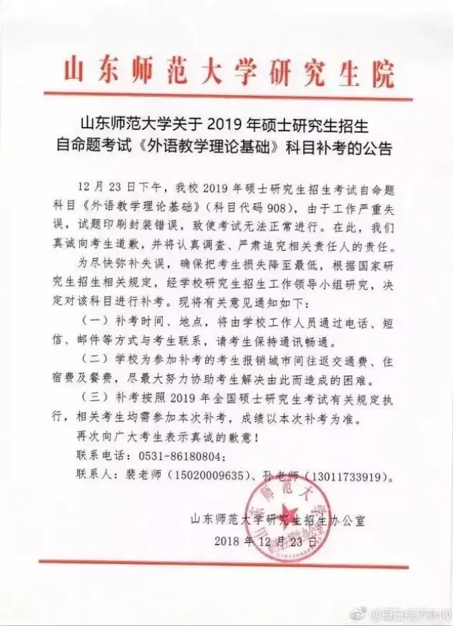 4、12月23日,山东师范大学在2019年硕士研究生招生考试中错将答案装进试题袋分发,导致考试无法进行。校方称将严肃追责,并安排补考。