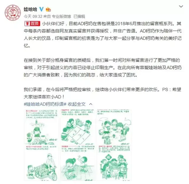 7、近日,娃哈哈AD钙奶瓶身印有“喝AD钙奶从A变到D”标语引关注。有网友认为有宣传丰胸功能之嫌。娃哈哈称该标语并非宣传丰胸,并在其官微发布声明:目前AD钙奶在售包装是2018年6月推出的留言瓶系列,已对涉事内容停印。杭州市场监管管理局工作人员表示,将介入调查。
