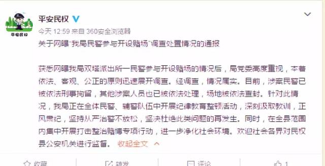 8、近日,有消息称“河南省商丘市民权县公安局双塔派出所一民警参与开设赌场”,对此民权县公安局1月24日在官方微博发布通告称,经调查,情况属实。涉案民警已被依法刑拘,其他涉案人员也已被依法处理。