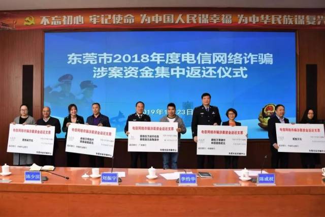 5、1月23日上午,东莞市反诈骗中心举行电信网络诈骗涉案资金集中返还活动,向9名受害人返还被骗款项300多万元,并表彰了一批资金止付返还先进单位。