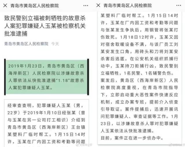 5、1月23日,青岛市黄岛区(西海岸新区)人民检察院以涉嫌故意杀人罪依法从快批准逮捕“1·18”故意杀人案犯罪嫌疑人玉某。