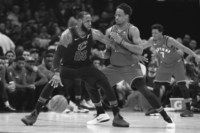 骑士头牌詹姆斯(左)力争率队在主场横扫德罗赞(右)领衔的猛龙晋级东部决赛。