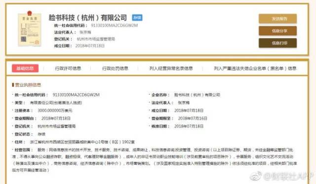 此外,其注册信息显示脸书的主要经营范围为:网络信息技术开发、技术服务、技术咨询、成果转让,科技信息咨询,投资管理,成年人的非证书劳动职业技能培训,会展服务,组织文化艺术交流活动,商务信息咨询、经济信息咨询,市场营销策划。