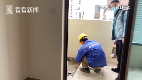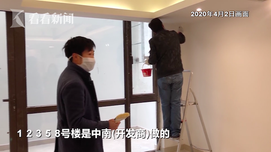 而在顶层的施工队不愿意多透露情况,仅说自己是来装修的。但是从其穿着的施工服,背后可以看到“中南装饰”字样,也恰恰是开发商施工队的公司名称。