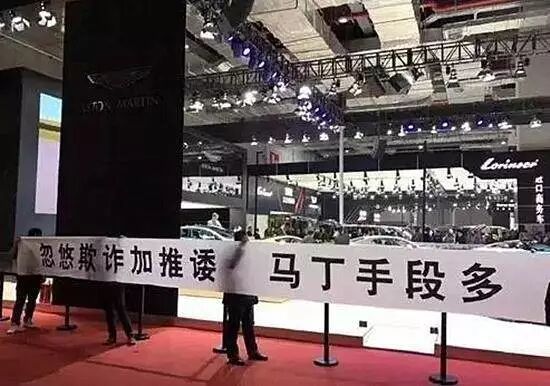 在2017年4月21日上海国际车展第一个公众日,就有车主在阿斯顿·马丁的展台上拉起横幅,上面赫然写着几个大字:垃圾马丁,新车大修;全新马丁车,机油烧精光,开缸修五次;忽悠欺诈加推诿,马丁手段多。