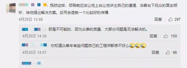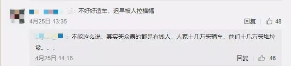 也正因这种“厚脸皮”的精神,众泰成为了汽车圈日常被调侃的主角:毫无意外,这次车展维权事件在微博上也炸开了锅,在座各位的评论也非常的“秀”!比如:
